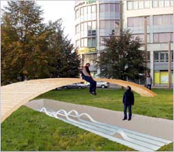 Ein Wellenspiel aus Federstahl wird in den Boden eingelassen, durch eine begehbare Glasfläche geschützt und von einem Bogen überspannt. Durch die Materialspannung des Federstahls ist es möglich die Wellen durch Luftzug in Bewegung zu versetzen.